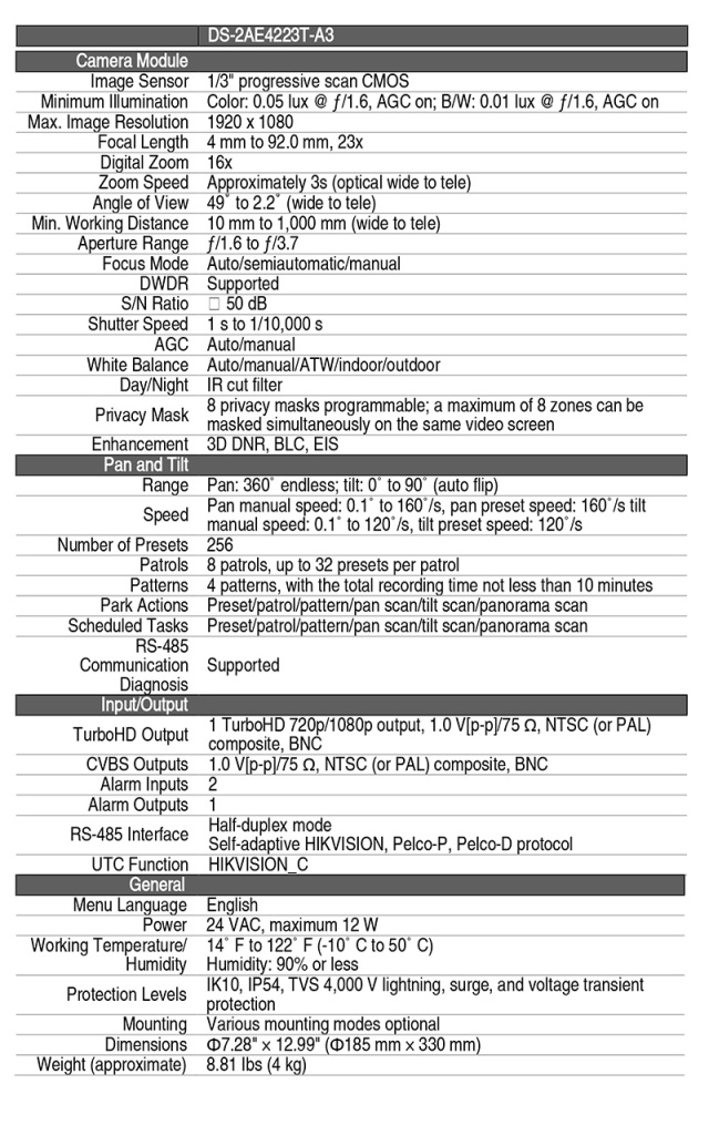 DS-2AE4223T-A 仕様表