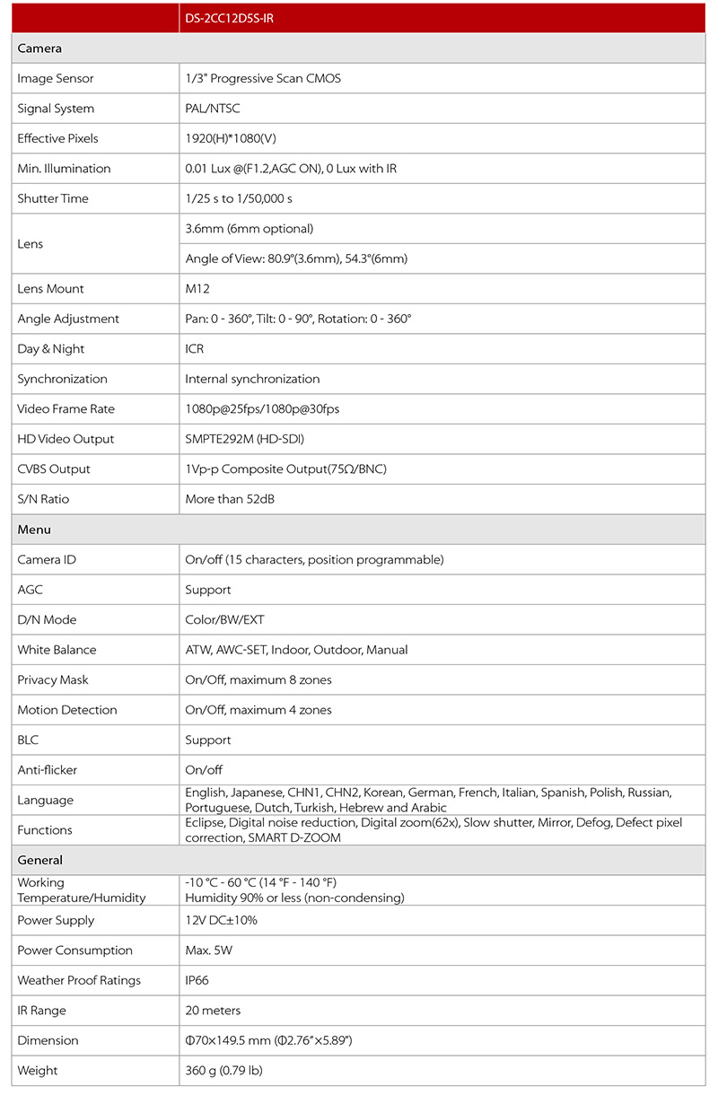 DS-2CC12D5S-IR 仕様表