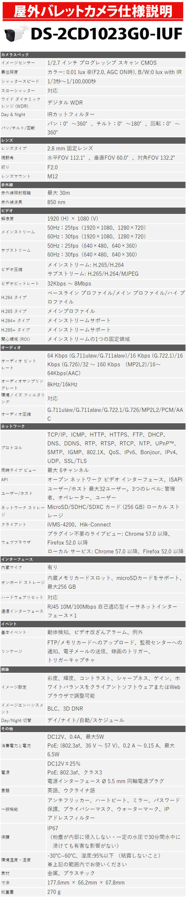 ※弊社サイトを盗用した詐欺サイトにご注意ください。 TOP 商品一覧 IPシステム屋外用防犯カメラ 高機能カメラシステムPoC/PoE 機能で選ぶカメラ電源不要 ワンケーブル PoE対応 機能で選ぶマイク内蔵 音声を聞く 画素数別243万画素 防犯カメラ HIKVISION(ハイクビジョン) 動体検知 マイク内蔵 IP 屋外屋内 カメラ電源不要 スマホ監視 PoE DS-2CD1023G0-IUF 243万画素 バレット型 レンズサイズ2.8mm 価格: ¥18,700 (税込) 販売期間: 数量: 個 在庫 在庫切れ 返品についての詳細はこちら レビューはありません