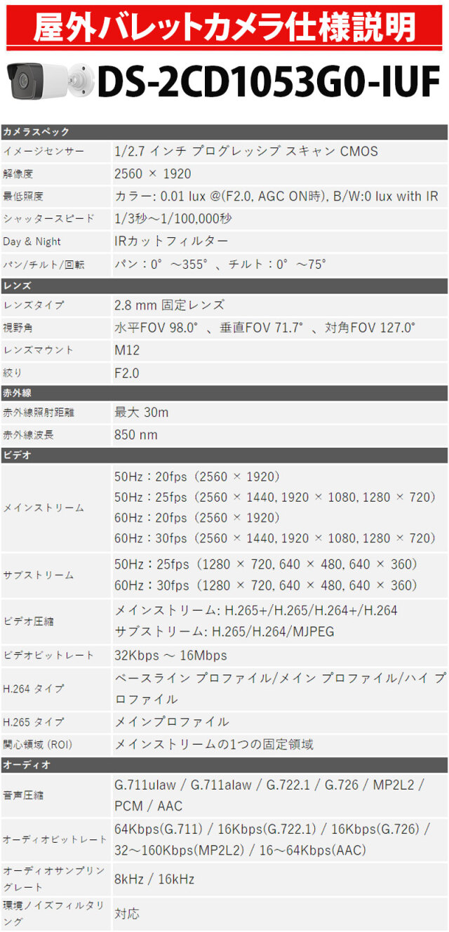 ※弊社サイトを盗用した詐欺サイトにご注意ください。 TOP 商品一覧 IPシステム屋外用防犯カメラ 高機能カメラシステムPoC/PoE 機能で選ぶカメラ電源不要 ワンケーブル PoE対応 機能で選ぶマイク内蔵 音声を聞く 画素数別500万画素 500万画素 HIKVISION マイク内蔵 防犯カメラ 屋外屋内 カメラ電源不要 スマホ PoE DS-2CD1053G0-IUF バレット型 2.8mm 価格: ¥20,220 (税込) 販売期間: 数量: 個 在庫 2個 返品についての詳細はこちら レビューはありません