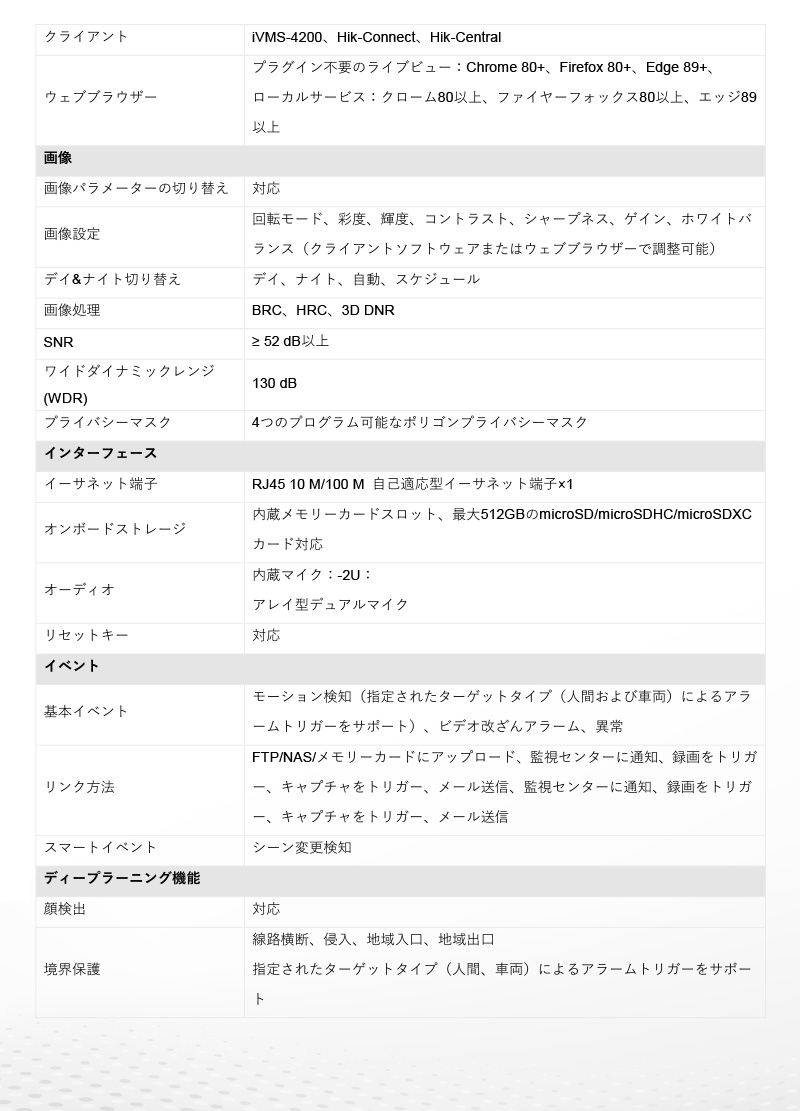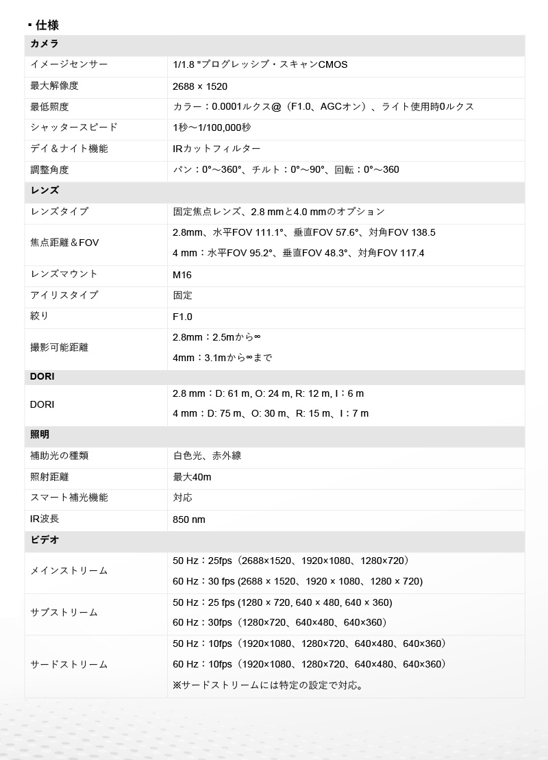 - 本モデル DS-2CD2047G3-LI2UYはSmart Hybrid Light(IR+ホワイトライト)のみ搭載。赤/青や白色のストロボ警告灯や音声アラームは付属していません。