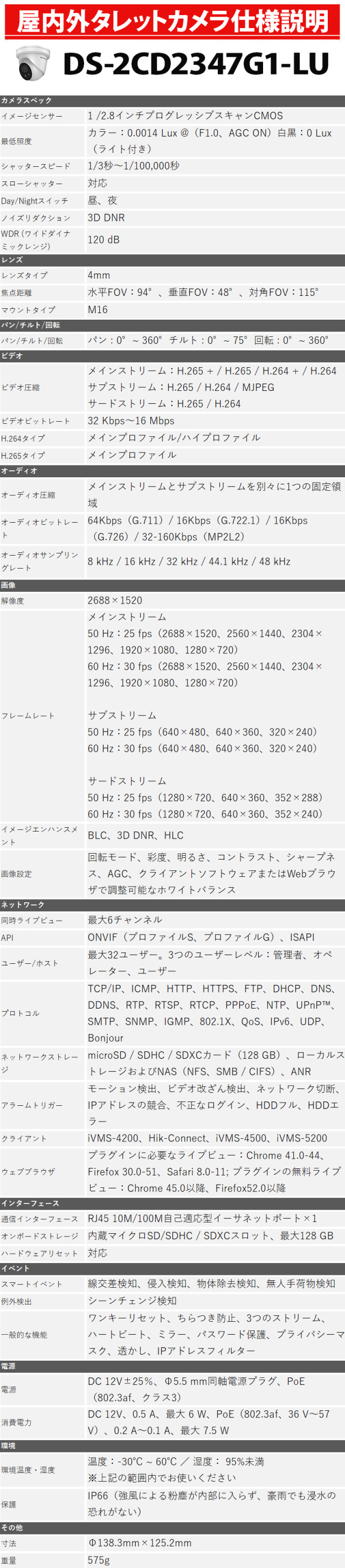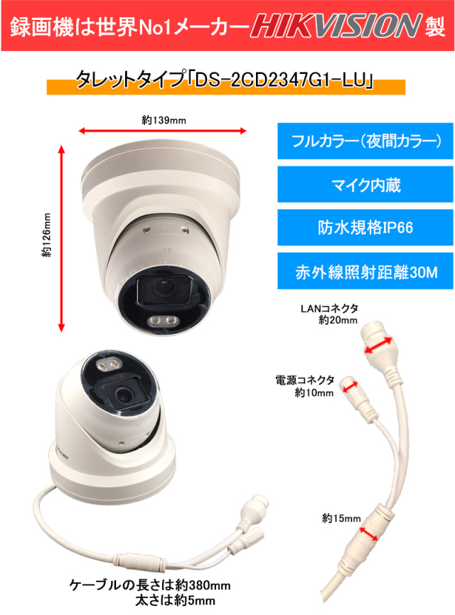 ※弊社サイトを盗用した詐欺サイトにご注意ください。 TOP 商品一覧 カメラ単品タレット型 高機能カメラシステムColorVu IPシステムHIKVISION 防犯カメラ 屋内屋外 フルカラー マイク内蔵 PoE 400万画素 NVR HIKVISION(ハイクビジョン) DS-2CD2347G1-LU タレット型 レンズサイズ4mm 価格: ¥26,900 (税込) 販売期間: 型番: DS-2CD2347G1-LU 数量: 個 在庫 4個 返品についての詳細はこちら レビューはありません 商品説明 世界最大手ブランドHIKVISION社製のタレット型カメラ!自動IP割当てで簡単接続、すぐにモニターに映ります! 商品仕様 製品名: 防犯カメラ IPカメラ 4mm 4メガピクセル WDR タレットネットワークカメラ DS-2CD2347G1-LU 型番: DS-2CD2347G1-LU 防犯カメラ 屋内屋外 フルカラー マイク内蔵 PoE 400万画素 NVR HIKVISION(ハイクビジョン) DS-2CD2347G1-LU タレット型 レンズサイズ4mm 価格: ¥26,900 (税込) 販売期間: 型番: DS-2CD2347G1-LU 数量: 個 在庫 4個 返品についての詳細はこちら レビューはありません