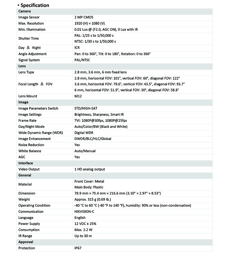 【提携倉庫より発送】[HIKVISION] [TVi-2M] 243万画素 CCTV 屋外用 バレット 1080P 2メガピクセル 逆光 露出補正 夜間30m EXIR 防水 DS-2CE17D0T-IT1