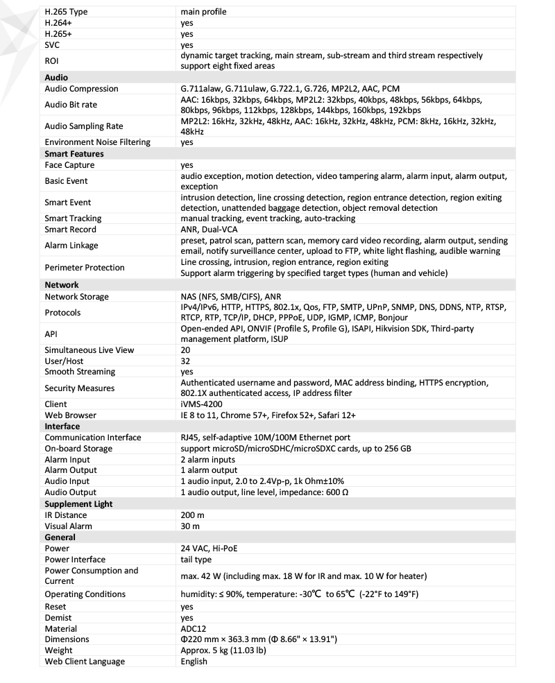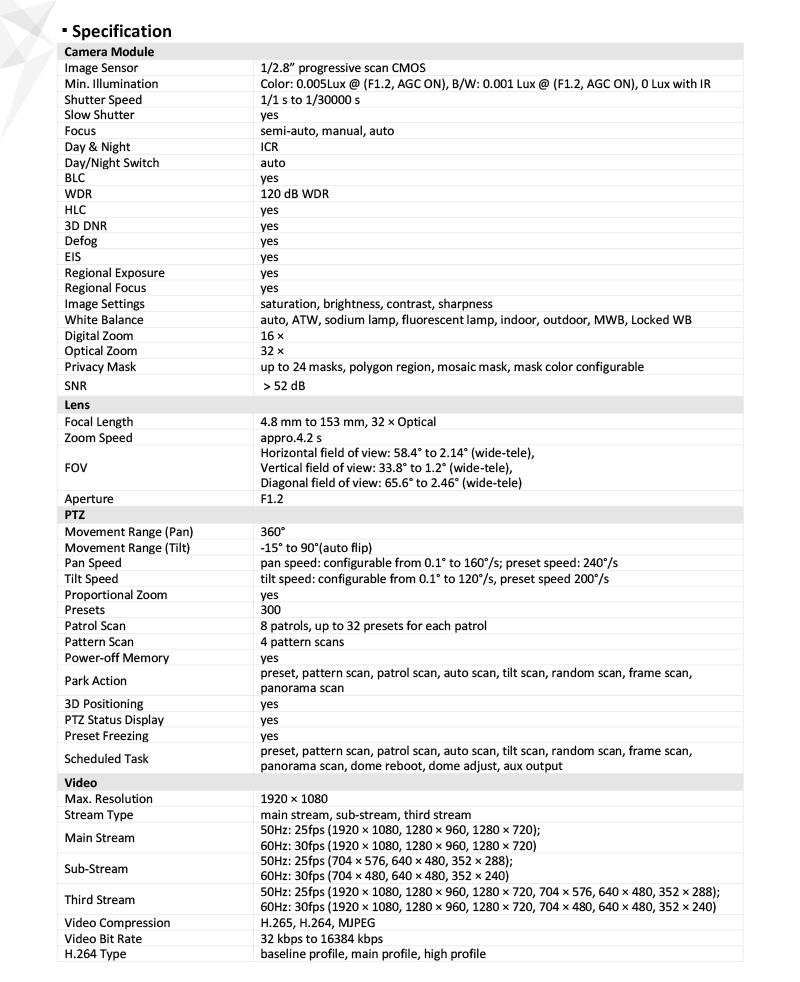 Hikvision DS-2DE7A232MW-AE (S5) 2MP 32倍IRネットワークスピードドームは、1/2.8インチのプログレッシブスキャンCMOSチップを採用し、32倍の光学ズームレンズにより広範囲を詳細に監視できます。河川、道路、鉄道、空港、広場、公園、景勝地、各種会場など、高精細な監視が求められるあらゆる場所に対応します。また、AcuSenseテクノロジーにより人物と車両の分類警報を実現し、アラームの効率と正確性を大幅に向上させます。