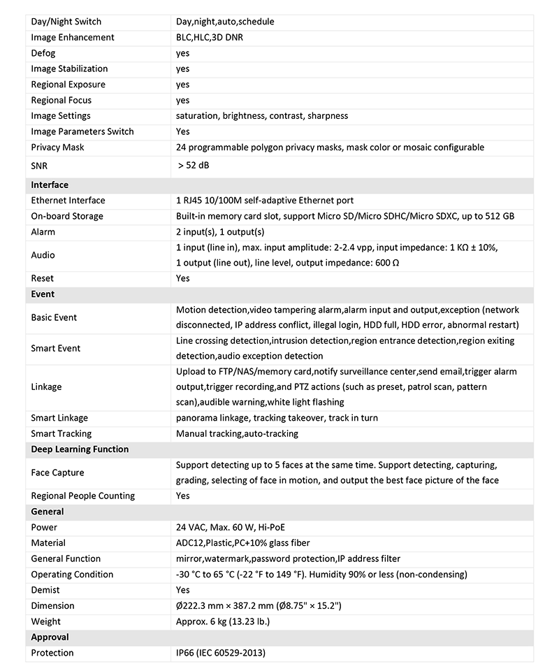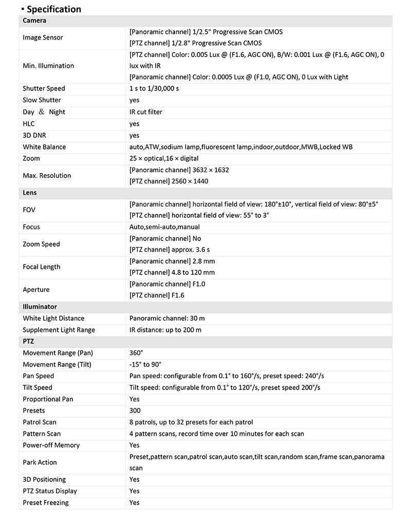 - PTZチャンネルで最大200mの赤外線距離、パノラマチャンネルで30mの白色光による広大な夜間視界