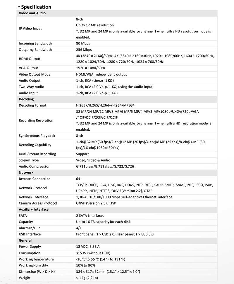 - 最大デコード性能:1チャンネル@32MP、2チャンネル@12MP、または16チャンネル@1080p