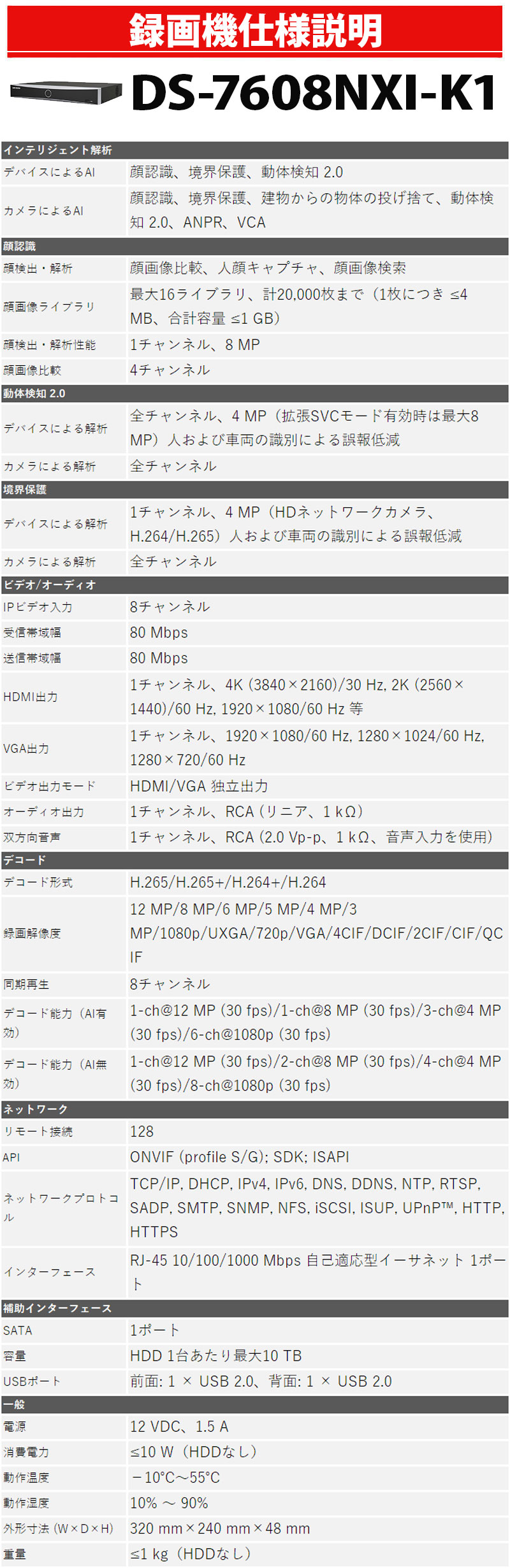DS-7608NXI-K1 仕様表