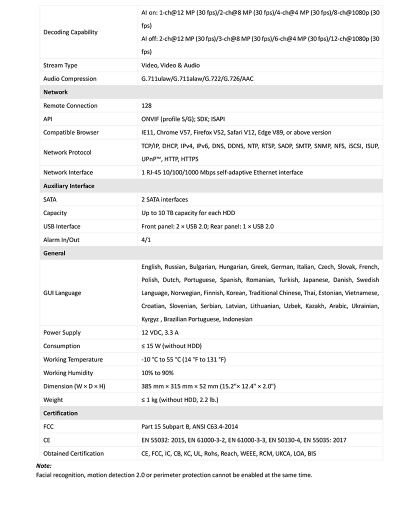 - 最大デコード性能:2チャンネル@12MP、3チャンネル@8MP、6チャンネル@4MP、または12チャンネル@1080p