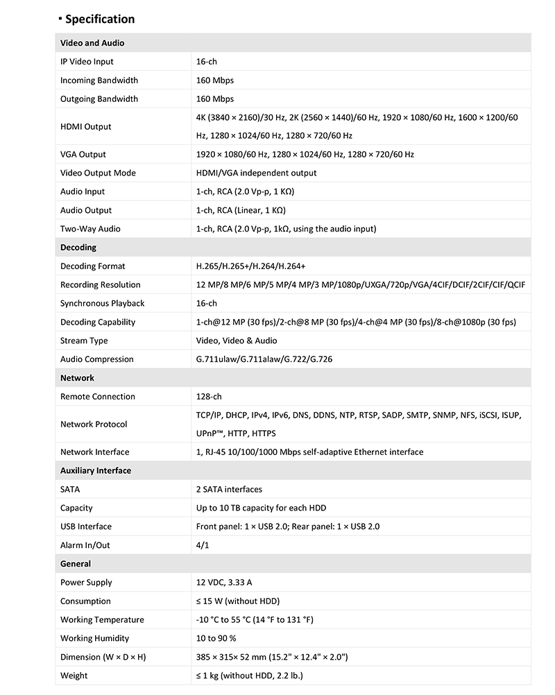 - 最大1チャンネル@12MP、または2チャンネル@8MP、または4チャンネル@4MP、または8チャンネル@1080pのデコード能力