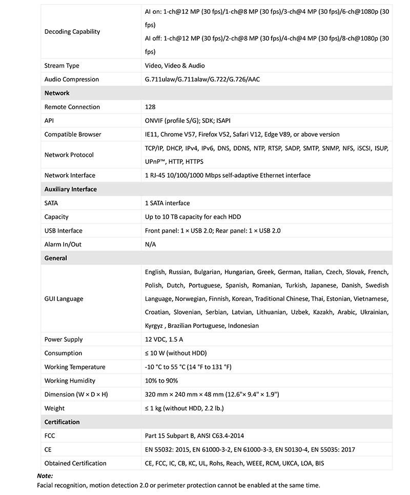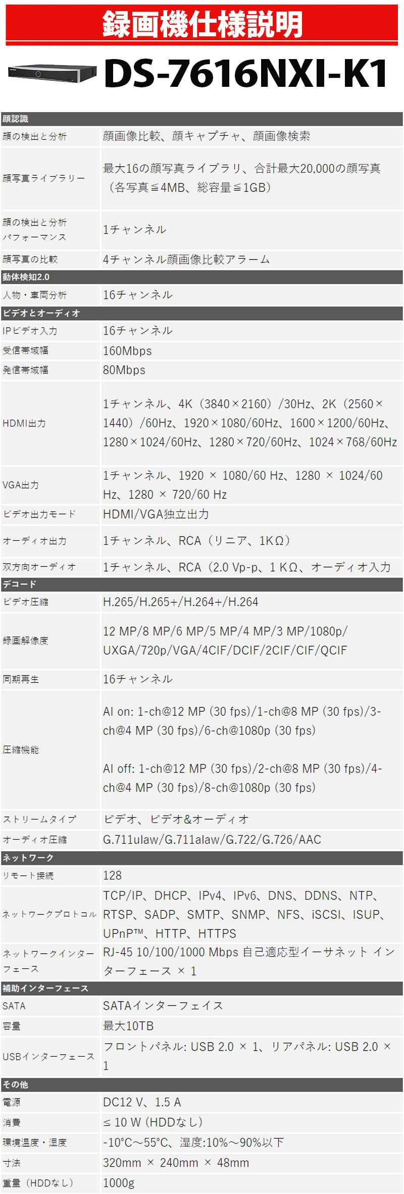 - 1チャンネルのビデオストリームによる顔認識、または4チャンネルの顔画像による顔認識に対応