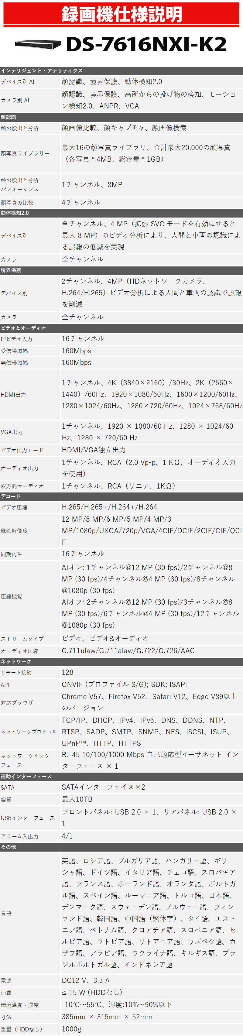 - 最大2チャンネル@12MP、または3チャンネル@8MP、または6チャンネル@4MP、または12チャンネル@1080pのデコード能力