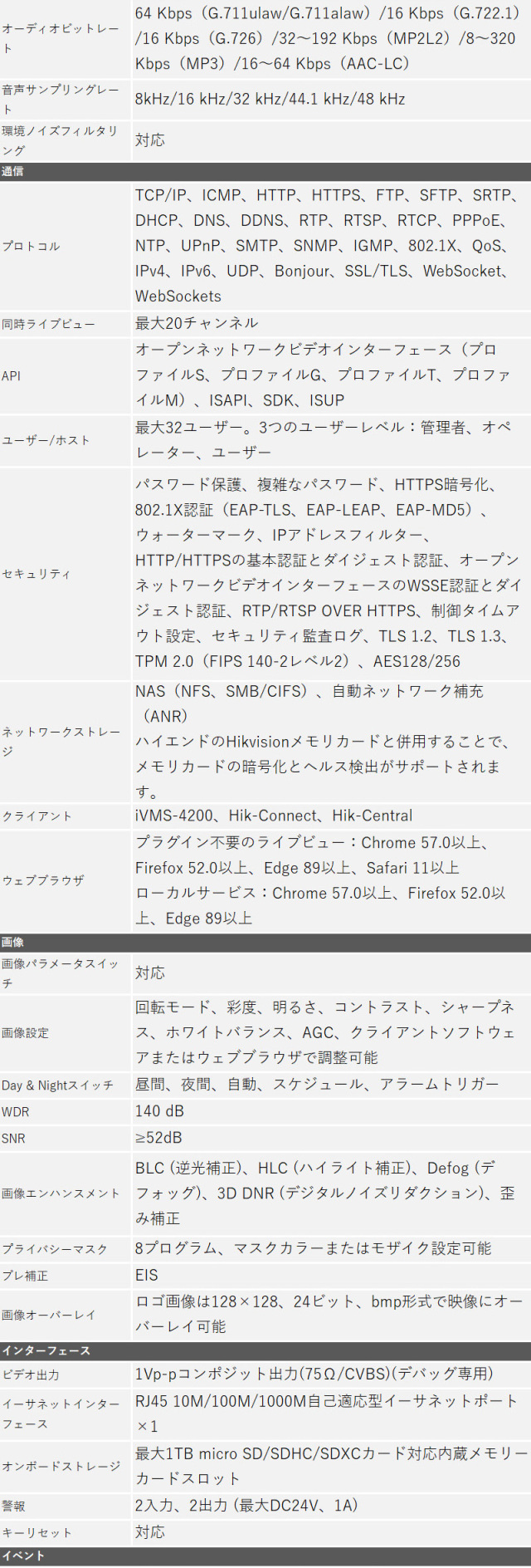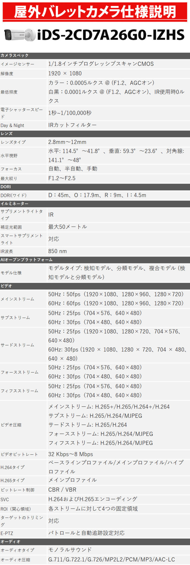 ※弊社サイトを盗用した詐欺サイトにご注意ください。 TOP 商品一覧 カメラ単品バレット型 画素数別243万画素 IPシステム屋外用防犯カメラ 防犯カメラ 屋外 バレットカメラ iDS-2CD7A26G0-IZHS HIKVISION(ハイクビジョン) 243万画素 IP バリフォーカル PoE レンズサイズ2.8mm-12mm 価格: ¥140,000 (税込) 販売期間: 型番: iDS-2CD7A26G0-IZHS 数量: 個 在庫 8個 返品についての詳細はこちら レビューはありません 商品説明 世界最大手ブランドHIKVISION社製のバレット型カメラ!自動IP割当てで簡単接続、すぐにモニターに映ります!防塵防水仕様なので屋外にも設置できます! 商品仕様 製品名: 防犯カメラ 屋外 バレットカメラ iDS-2CD7A46G0-IZHS HIKVISION(ハイクビジョン) 400万画素 IP バリフォーカル PoE レンズサイズ2.8mm-12mm 型番: iDS-2CD7A26G0-IZHS 防犯カメラ 屋外 バレットカメラ iDS-2CD7A26G0-IZHS HIKVISION(ハイクビジョン) 243万画素 IP バリフォーカル PoE レンズサイズ2.8mm-12mm 価格: ¥140,000 (税込) 販売期間: 型番: iDS-2CD7A26G0-IZHS 数量: 個 在庫 8個 返品についての詳細はこちら レビューはありません