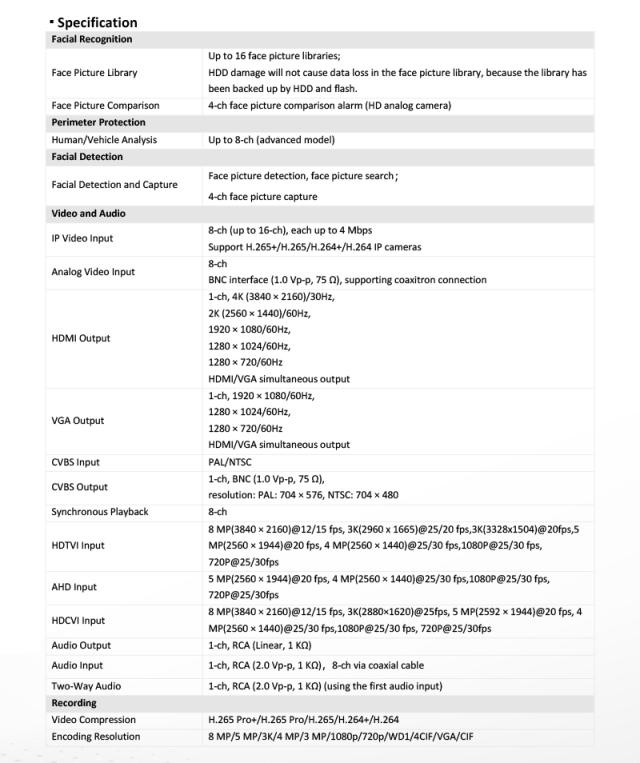 - ディープラーニングアルゴリズムに基づく、4チャンネルの顔認識または8チャンネルの高度な境界保護に対応