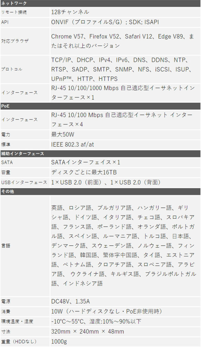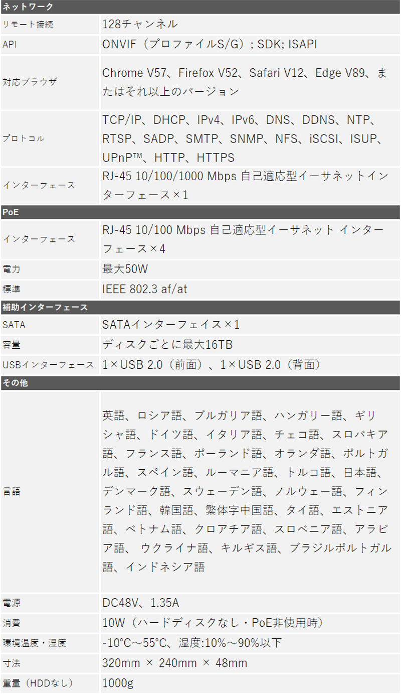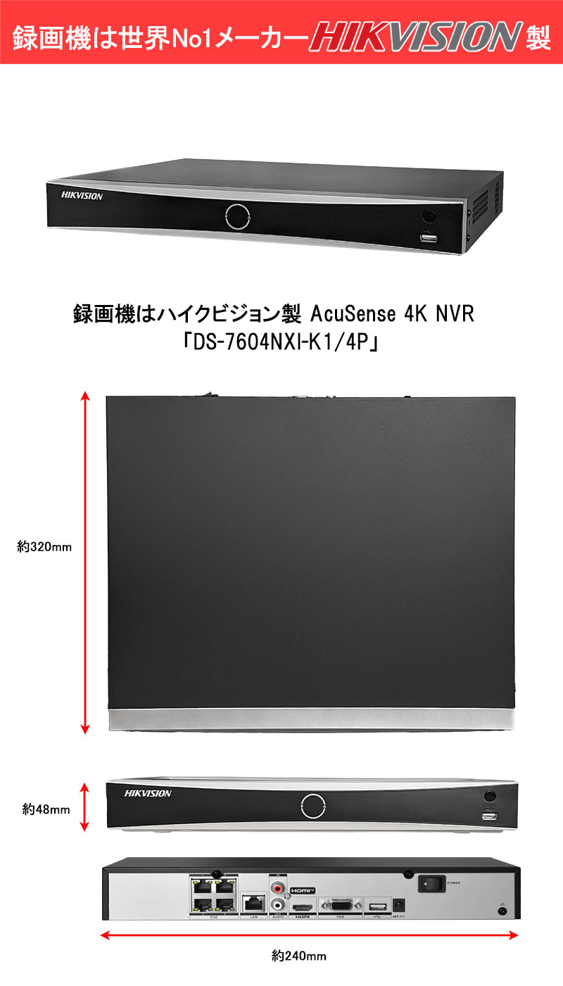 ※弊社サイトを盗用した詐欺サイトにご注意ください。 TOP 商品一覧 カメラ1~4台セット243万画素セットIP POEセット NVRセット243万画素セットIP POEセット カメラ電源不要セットNVR・PoEセットカメラ1~4台セット (4ch録画機) 防犯カメラセット 画素数別243万画素 レビュープレゼント 防犯カメラセット 屋内屋外 家庭用 HIKVISION(ハイクビジョン) 243万画素 IP 1~4台セット レコーダーHDD別 カメラ電源不要 スマホ監視 NVR PoE NVR-SET-4CH 価格: ¥49,700 (税込) 販売期間: メーカー: HIKVISION 型番: NVR-SET-4CH セットカメラ1台目(必須): 選択してください 屋外用バレットカメラ(¥0) 屋内外用ドームカメラ(¥0) 追加カメラ2台目: 選択してください 屋外用バレットカメラ(¥15,000) 屋内外用ドームカメラ(¥15,000) 追加カメラ3台目: 選択してください 屋外用バレットカメラ(¥15,000) 屋内外用ドームカメラ(¥15,000) 追加カメラ4台目: 選択してください 屋外用バレットカメラ(¥15,000) 屋内外用ドームカメラ(¥15,000) 1本目LANケーブルの長さを選択(必須): 選択してください ケーブル20m(¥0) ケーブル30m(¥1,160) ケーブル50m(¥1,440) 2本目LANケーブルの長さを選択: 選択してください ケーブル20m(¥0) ケーブル30m(¥1,160) ケーブル50m(¥1,440) 3本目LANケーブルの長さを選択: 選択してください ケーブル20m(¥0) ケーブル30m(¥1,160) ケーブル50m(¥1,440) 4本目LANケーブルの長さを選択: 選択してください ケーブル20m(¥0) ケーブル30m(¥1,160) ケーブル50m(¥1,440) セット用HDD容量(必須): 選択してください HDDなし(¥0) HDD1TB(¥9,000) HDD2TB(¥15,500) HDD3TB(¥20,000) HDD4TB(¥22,000) HDD6TB(¥36,000) モニター: 選択してください モニターなし(¥0) 7インチモニターBH-MNT700T(¥24,900) 8インチモニターBH-MNT800T(¥24,500) 数量: 個 在庫 10個 返品についての詳細はこちら レビューはありません 仕様説明 商品仕様 製品名: 【防犯カメラセット】4台|HIKVISION(ハイクビジョン)|高画質|PoE対応NVR 4ch 録画機|屋外・屋内対応|マイク内蔵 HDD別|防水設計 型番: NVR-SET-4CH メーカー: HIKVISION 防犯カメラセット 屋内屋外 家庭用 HIKVISION(ハイクビジョン) 243万画素 IP 1~4台セット レコーダーHDD別 カメラ電源不要 スマホ監視 NVR PoE NVR-SET-4CH 価格: ¥49,700 (税込) 販売期間: メーカー: HIKVISION 型番: NVR-SET-4CH セットカメラ1台目(必須): 選択してください 屋外用バレットカメラ(¥0) 屋内外用ドームカメラ(¥0) 追加カメラ2台目: 選択してください 屋外用バレットカメラ(¥15,000) 屋内外用ドームカメラ(¥15,000) 追加カメラ3台目: 選択してください 屋外用バレットカメラ(¥15,000) 屋内外用ドームカメラ(¥15,000) 追加カメラ4台目: 選択してください 屋外用バレットカメラ(¥15,000) 屋内外用ドームカメラ(¥15,000) 1本目LANケーブルの長さを選択(必須): 選択してください ケーブル20m(¥0) ケーブル30m(¥1,160) ケーブル50m(¥1,440) 2本目LANケーブルの長さを選択: 選択してください ケーブル20m(¥0) ケーブル30m(¥1,160) ケーブル50m(¥1,440) 3本目LANケーブルの長さを選択: 選択してください ケーブル20m(¥0) ケーブル30m(¥1,160) ケーブル50m(¥1,440) 4本目LANケーブルの長さを選択: 選択してください ケーブル20m(¥0) ケーブル30m(¥1,160) ケーブル50m(¥1,440) セット用HDD容量(必須): 選択してください HDDなし(¥0) HDD1TB(¥9,000) HDD2TB(¥15,500) HDD3TB(¥20,000) HDD4TB(¥22,000) HDD6TB(¥36,000) モニター: 選択してください モニターなし(¥0) 7インチモニターBH-MNT700T(¥24,900) 8インチモニターBH-MNT800T(¥24,500) 数量: 個 在庫 10個 返品についての詳細はこちら レビューはありません 関連商品 防犯カメラ 屋内屋外 HIKVISION(ハイクビジョン) 243万画素 1~4台セット コンパクトレコーダーHDD別 アナログ 4chDVR スマホ監視 BHC-SET-4CH ¥20,600(税込) 防犯カメラセット 屋内屋外 HIKVISION(ハイクビジョン) ワンケーブル(PoC)アナログ 243万画素 1~4台セット レコーダーHDD別 4chDVR POC-SET-4CH ¥40,700(税込) 防犯カメラセット 屋内屋外 HIKVISION(ハイクビジョン) ワンケーブル(PoC)アナログ 243万画素 5~8台セット レコーダーHDD別 8chDVR POC-SET-8CH ¥96,000(税込) 防犯カメラセット 243万画素 屋外屋内 HIKVISION(ハイクビジョン) 4台セット 家庭用 アナログカメラ レコーダーHDD別 4chDVR スマホ監視 SELECT-SET-AHD ¥37,100(税込) 243万画素 防犯カメラセット アナログ 屋内屋外カメラ8台 レコーダーHDD3TB込 8chDVR HIKVISION製 スマホ監視 TVI-SET-CAM8-3TB ¥99,900(税込) 防犯カメラ 屋内屋外 HIKVISION(ハイクビジョン) アナログ 1~4台低価格セット 243万画素 コンパクトレコーダーHDD別 4chDVR スマホ監視 JSTSET-4CH ¥16,600(税込) 防犯カメラ 業務用 屋内屋外 HIKVISION(ハイクビジョン) バリフォーカル ワンケーブル(PoC) 4台セット レコーダーHDD別 カメラ電源不要 TVI-SET-ONE-4CH ¥165,500(税込) 防犯カメラ 業務用 屋内屋外 HIKVISION(ハイクビジョン) バリフォーカル ワンケーブル(PoC) 16台セット レコーダーHDD別 カメラ電源不要 TVI-SET-ONE-16CH ¥854,000(税込) 防犯カメラセット 屋内屋外 HIKVISION(ハイクビジョン) アナログ 9~16台低価格セット 243万画素 コンパクトレコーダーHDD別 16chDVR スマホ監視 JSTSET-16CH ¥84,000(税込) ~ 防犯カメラセット 屋内屋外 HIKVISION(ハ