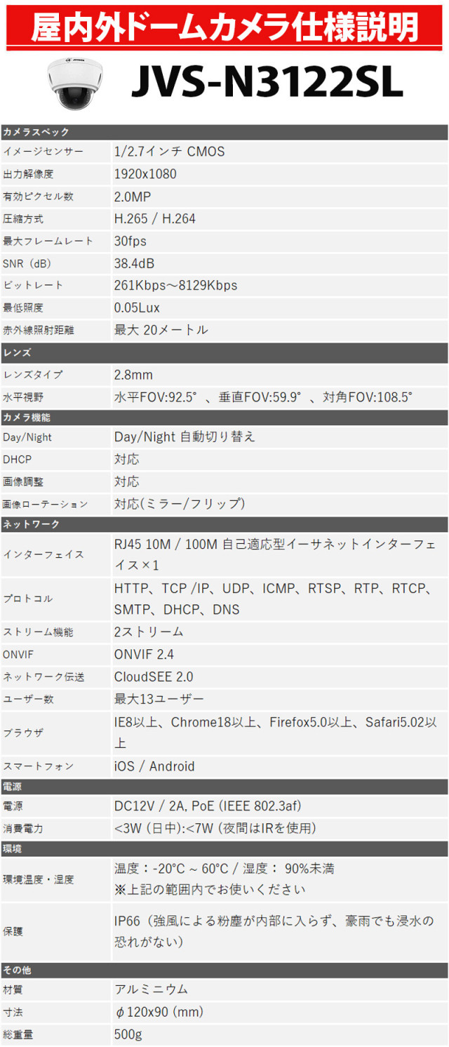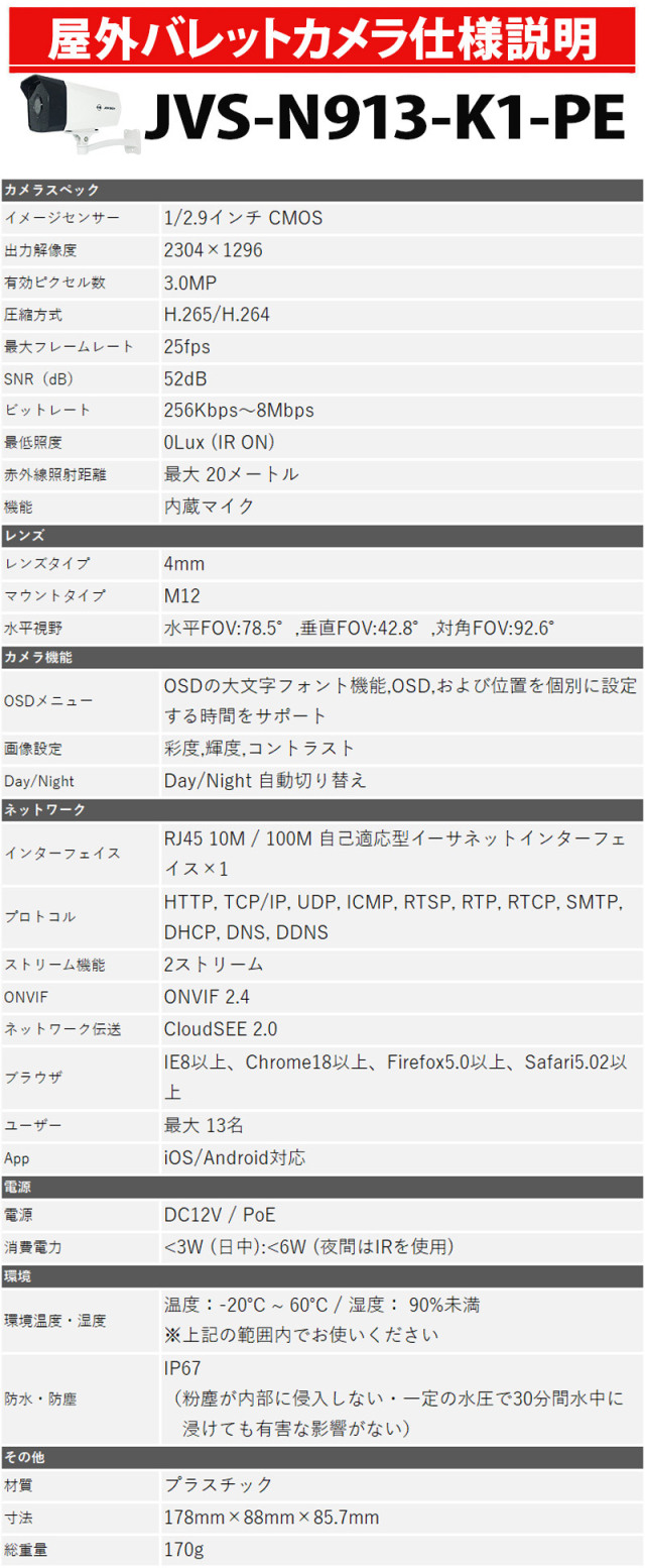 ※弊社サイトを盗用した詐欺サイトにご注意ください。 TOP 商品一覧 カメラ1~4台セット243万画素セットIP POEセット NVRセット243万画素セットIP POEセット カメラ電源不要セットNVR・PoEセットカメラ1~4台セット (4ch録画機) 防犯カメラセット 画素数別243万画素 防犯カメラ 屋内屋外 243万画素 IP低価格 1~4台セット コンパクトレコーダーHDD別 カメラ電源不要 NVR-SET3-4CH 価格: ¥22,900 (税込) 販売期間: メーカー: JOVISION 型番: NVR-SET3-4CH セットカメラ1台目(必須): 選択してください 屋外用バレットカメラ 屋内外用ドームカメラ 追加カメラ2台目: 選択してください 屋外用バレットカメラ(¥9,000) 屋内外用ドームカメラ(¥9,000) 追加カメラ3台目: 選択してください 屋外用バレットカメラ(¥9,000) 屋内外用ドームカメラ(¥9,000) 追加カメラ4台目: 選択してください 屋外用バレットカメラ(¥9,000) 屋内外用ドームカメラ(¥9,000) 1本目LANケーブルの長さを選択(必須): 選択してください ケーブル20m(¥0) ケーブル30m(¥1,160) 【入荷待ち】ケーブル50m(¥1,440) 2本目LANケーブルの長さを選択: 選択してください ケーブル20m(¥0) ケーブル30m(¥1,160) 【入荷待ち】ケーブル50m(¥1,440) 3本目LANケーブルの長さを選択: 選択してください ケーブル20m(¥0) ケーブル30m(¥1,160) 【入荷待ち】ケーブル50m(¥1,440) 4本目LANケーブルの長さを選択: 選択してください ケーブル20m(¥0) ケーブル30m(¥1,160) 【入荷待ち】ケーブル50m(¥1,440) セット用HDD容量(必須): 選択してください HDDなし(¥0) HDD1TB(¥9,000) HDD2TB(¥15,500) HDD3TB(¥20,000) HDD4TB(¥22,000) HDD6TB(¥30,000) モニター: 選択してください モニターなし(¥0) 7インチモニターBH-MNT700T(¥24,400) 8インチモニターBH-MNT800T(¥23,450) 数量: 個 在庫 在庫切れ 返品についての詳細はこちら レビューはありません ↑こちらから購入できます! 商品仕様 製品名: 【防犯カメラセット】4台|HIKVISION(ハイクビジョン)|高画質|NVRレコーダー付き|屋外・屋内対応|マイク内蔵 HDD別 型番: NVR-SET3-4CH メーカー: JOVISION 防犯カメラ 屋内屋外 243万画素 IP低価格 1~4台セット コンパクトレコーダーHDD別 カメラ電源不要 NVR-SET3-4CH 価格: ¥22,900 (税込) 販売期間: メーカー: JOVISION 型番: NVR-SET3-4CH セットカメラ1台目(必須): 選択してください 屋外用バレットカメラ 屋内外用ドームカメラ 追加カメラ2台目: 選択してください 屋外用バレットカメラ(¥9,000) 屋内外用ドームカメラ(¥9,000) 追加カメラ3台目: 選択してください 屋外用バレットカメラ(¥9,000) 屋内外用ドームカメラ(¥9,000) 追加カメラ4台目: 選択してください 屋外用バレットカメラ(¥9,000) 屋内外用ドームカメラ(¥9,000) 1本目LANケーブルの長さを選択(必須): 選択してください ケーブル20m(¥0) ケーブル30m(¥1,160) 【入荷待ち】ケーブル50m(¥1,440) 2本目LANケーブルの長さを選択: 選択してください ケーブル20m(¥0) ケーブル30m(¥1,160) 【入荷待ち】ケーブル50m(¥1,440) 3本目LANケーブルの長さを選択: 選択してください ケーブル20m(¥0) ケーブル30m(¥1,160) 【入荷待ち】ケーブル50m(¥1,440) 4本目LANケーブルの長さを選択: 選択してください ケーブル20m(¥0) ケーブル30m(¥1,160) 【入荷待ち】ケーブル50m(¥1,440) セット用HDD容量(必須): 選択してください HDDなし(¥0) HDD1TB(¥9,000) HDD2TB(¥15,500) HDD3TB(¥20,000) HDD4TB(¥22,000) HDD6TB(¥30,000) モニター: 選択してください モニターなし(¥0) 7インチモニターBH-MNT700T(¥24,400) 8インチモニターBH-MNT800T(¥23,450) 数量: 個 在庫 在庫切れ 返品についての詳細はこちら レビューはありません 関連商品 防犯カメラ 屋内屋外 HIKVISION(ハイクビジョン) 243万画素 1~4台セット コンパクトレコーダーHDD別 アナログ 4chDVR スマホ監視 BHC-SET-4CH ¥20,600(税込) 防犯カメラセット 屋内屋外 HIKVISION(ハイクビジョン) ワンケーブル(PoC)アナログ 243万画素 1~4台セット レコーダーHDD別 4chDVR POC-SET-4CH ¥40,700(税込) 防犯カメラセット 屋内屋外 HIKVISION(ハイクビジョン) ワンケーブル(PoC)アナログ 243万画素 5~8台セット レコーダーHDD別 8chDVR POC-SET-8CH ¥96,000(税込) 防犯カメラセット 243万画素 屋外屋内 HIKVISION(ハイクビジョン) 4台セット 家庭用 アナログカメラ レコーダーHDD別 4chDVR スマホ監視 SELECT-SET-AHD ¥37,100(税込) 243万画素 防犯カメラセット アナログ 屋内屋外カメラ8台 レコーダーHDD3TB込 8chDVR HIKVISION製 スマホ監視 TVI-SET-CAM8-3TB ¥99,900(税込) 防犯カメラ 屋内屋外 HIKVISION(ハイクビジョン) アナログ 1~4台低価格セット 243万画素 コンパクトレコーダーHDD別 4chDVR スマホ監視 JSTSET-4CH ¥16,600(税込) 防犯カメラ 業務用 屋内屋外 HIKVISION(ハイクビジョン) バリフォーカル ワンケーブル(PoC) 4台セット レコーダーHDD別 カメラ電源不要 TVI-SET-ONE-4CH ¥165,500(税込) 防犯カメラ 業務用 屋内屋外 HIKVISION(ハイクビジョン) バリフォーカル ワンケーブル(PoC) 16台セット レコーダーHDD別 カメラ電源不要 TVI-SET-ONE-16CH ¥854,000(税込) 防犯カメラセット 屋内屋外 HIKVISION(ハイクビジョン) アナログ 9~16台低価格セット 243万画素 コンパクトレコーダーHDD別 16chDVR スマホ監視 JSTSET-16CH ¥84,000(税込) ~ 防犯カメラセット 屋内屋外 HIKVISIO