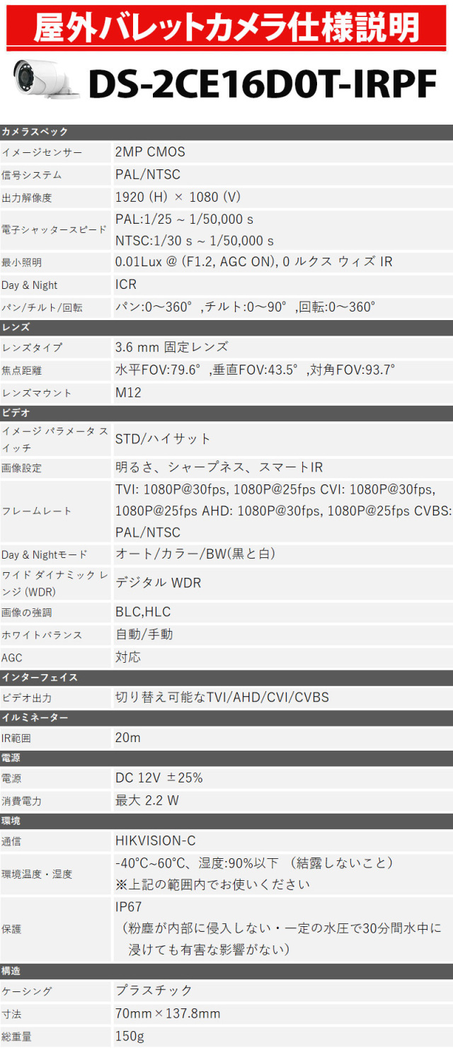 ※弊社サイトを盗用した詐欺サイトにご注意ください。 TOP 商品一覧 カメラ1~4台セット243万画素セットアナログセット アナログハイビジョンセット243万画素セットアナログセット 防犯カメラセット 画素数別243万画素 レビュープレゼント 防犯カメラセット 243万画素 屋内屋外 HIKVISION(ハイクビジョン) アナログ 1~4台セット レコーダーHDD別 4chDVR スマホ監視 TVI-SET-4CH 価格: ¥24,300 (税込) 販売期間: メーカー: HIKVISION 型番: tvi-set-4ch セットカメラ1台目(必須): 選択してください 屋外用バレット(¥0) 屋内用ドーム(¥0) 2台目カメラ選択(追加料金): 選択してください 屋外用バレット(¥5,500) 屋内用ドーム(¥5,500) 3台目カメラ選択(追加料金): 選択してください 屋外用バレット(¥5,500) 屋内用ドーム(¥5,500) 4台目カメラ選択(追加料金): 選択してください 屋外用バレット(¥5,500) 屋内用ドーム(¥5,500) 1本目TVIケーブルの長さを選択(必須): 選択してください ケーブル10m(¥0) ケーブル20m(¥2,200) ケーブル30m(¥3,010) ケーブル50m(¥4,610) 2本目TVIケーブルの長さを選択: 選択してください ケーブル10m(¥0) ケーブル20m(¥2,200) ケーブル30m(¥3,010) ケーブル50m(¥4,610) 3本目TVIケーブルの長さを選択: 選択してください ケーブル10m(¥0) ケーブル20m(¥2,200) ケーブル30m(¥3,010) ケーブル50m(¥4,610) 4本目TVIケーブルの長さを選択: 選択してください ケーブル10m(¥0) ケーブル20m(¥2,200) ケーブル30m(¥3,010) ケーブル50m(¥4,610) セット用HDD容量(必須): 選択してください HDDなし(¥0) HDD1TB(¥9,000) HDD2TB(¥13,000) HDD3TB(¥16,800) HDD4TB(¥18,000) HDD6TB(¥30,000) 電源分配ケーブル(必須): 選択してください なし(¥0) 電源分配ケーブル×1(¥3,850) 数量: 個 在庫 23個 返品についての詳細はこちら レビューはありません ↑こちらから購入できます! 商品説明 世界No.1シェアブランドの防犯カメラセット 243万画素の高機能・高画質のカメラに長時間録画可能な録画機もセット! 商品仕様 製品名: 【防犯カメラセット】4台|HIKVISION(ハイクビジョン)|高画質|アナログ有線タイプ|同軸ケーブル接続|屋外・屋内対応|HDD別 型番: tvi-set-4ch メーカー: HIKVISION 防犯カメラセット 243万画素 屋内屋外 HIKVISION(ハイクビジョン) アナログ 1~4台セット レコーダーHDD別 4chDVR スマホ監視 TVI-SET-4CH 価格: ¥24,300 (税込) 販売期間: メーカー: HIKVISION 型番: tvi-set-4ch セットカメラ1台目(必須): 選択してください 屋外用バレット(¥0) 屋内用ドーム(¥0) 2台目カメラ選択(追加料金): 選択してください 屋外用バレット(¥5,500) 屋内用ドーム(¥5,500) 3台目カメラ選択(追加料金): 選択してください 屋外用バレット(¥5,500) 屋内用ドーム(¥5,500) 4台目カメラ選択(追加料金): 選択してください 屋外用バレット(¥5,500) 屋内用ドーム(¥5,500) 1本目TVIケーブルの長さを選択(必須): 選択してください ケーブル10m(¥0) ケーブル20m(¥2,200) ケーブル30m(¥3,010) ケーブル50m(¥4,610) 2本目TVIケーブルの長さを選択: 選択してください ケーブル10m(¥0) ケーブル20m(¥2,200) ケーブル30m(¥3,010) ケーブル50m(¥4,610) 3本目TVIケーブルの長さを選択: 選択してください ケーブル10m(¥0) ケーブル20m(¥2,200) ケーブル30m(¥3,010) ケーブル50m(¥4,610) 4本目TVIケーブルの長さを選択: 選択してください ケーブル10m(¥0) ケーブル20m(¥2,200) ケーブル30m(¥3,010) ケーブル50m(¥4,610) セット用HDD容量(必須): 選択してください HDDなし(¥0) HDD1TB(¥9,000) HDD2TB(¥13,000) HDD3TB(¥16,800) HDD4TB(¥18,000) HDD6TB(¥30,000) 電源分配ケーブル(必須): 選択してください なし(¥0) 電源分配ケーブル×1(¥3,850) 数量: 個 在庫 23個 返品についての詳細はこちら レビューはありません 関連商品 防犯カメラ 屋内屋外 HIKVISION(ハイクビジョン) 243万画素 1~4台セット コンパクトレコーダーHDD別 アナログ 4chDVR スマホ監視 BHC-SET-4CH ¥20,600(税込) 防犯カメラセット 屋内屋外 HIKVISION(ハイクビジョン) ワンケーブル(PoC)アナログ 243万画素 1~4台セット レコーダーHDD別 4chDVR POC-SET-4CH ¥40,700(税込) 防犯カメラセット 屋内屋外 HIKVISION(ハイクビジョン) ワンケーブル(PoC)アナログ 243万画素 5~8台セット レコーダーHDD別 8chDVR POC-SET-8CH ¥96,000(税込) 防犯カメラセット 243万画素 屋外屋内 HIKVISION(ハイクビジョン) 4台セット 家庭用 アナログカメラ レコーダーHDD別 4chDVR スマホ監視 SELECT-SET-AHD ¥37,100(税込) 243万画素 防犯カメラセット アナログ 屋内屋外カメラ8台 レコーダーHDD3TB込 8chDVR HIKVISION製 スマホ監視 TVI-SET-CAM8-3TB ¥97,900(税込) 防犯カメラ 屋内屋外 HIKVISION(ハイクビジョン) アナログ 1~4台低価格セット 243万画素 コンパクトレコーダーHDD別 4chDVR スマホ監視 JSTSET-4CH ¥16,600(税込) 防犯カメラ 業務用 屋内屋外 HIKVISION(ハイクビジョン) バリフォーカル ワンケーブル(PoC) 4台セット レコーダーHDD別 カメラ電源不要 TVI-SET-ONE-4CH ¥165,500(税込) 防犯カメラ 業務用 屋内屋外 HIKVISION(ハイクビジョン) バリフォーカル ワンケーブル(PoC) 16台セット レコーダーHDD別 カメラ電源不要 TVI-SET-ONE-16CH ¥854,000(税込) 防犯カメラセット 屋内屋外 HIKVISION(ハイクビジョン) アナログ 9~16台低価格セット 243万画素 コンパクトレコー